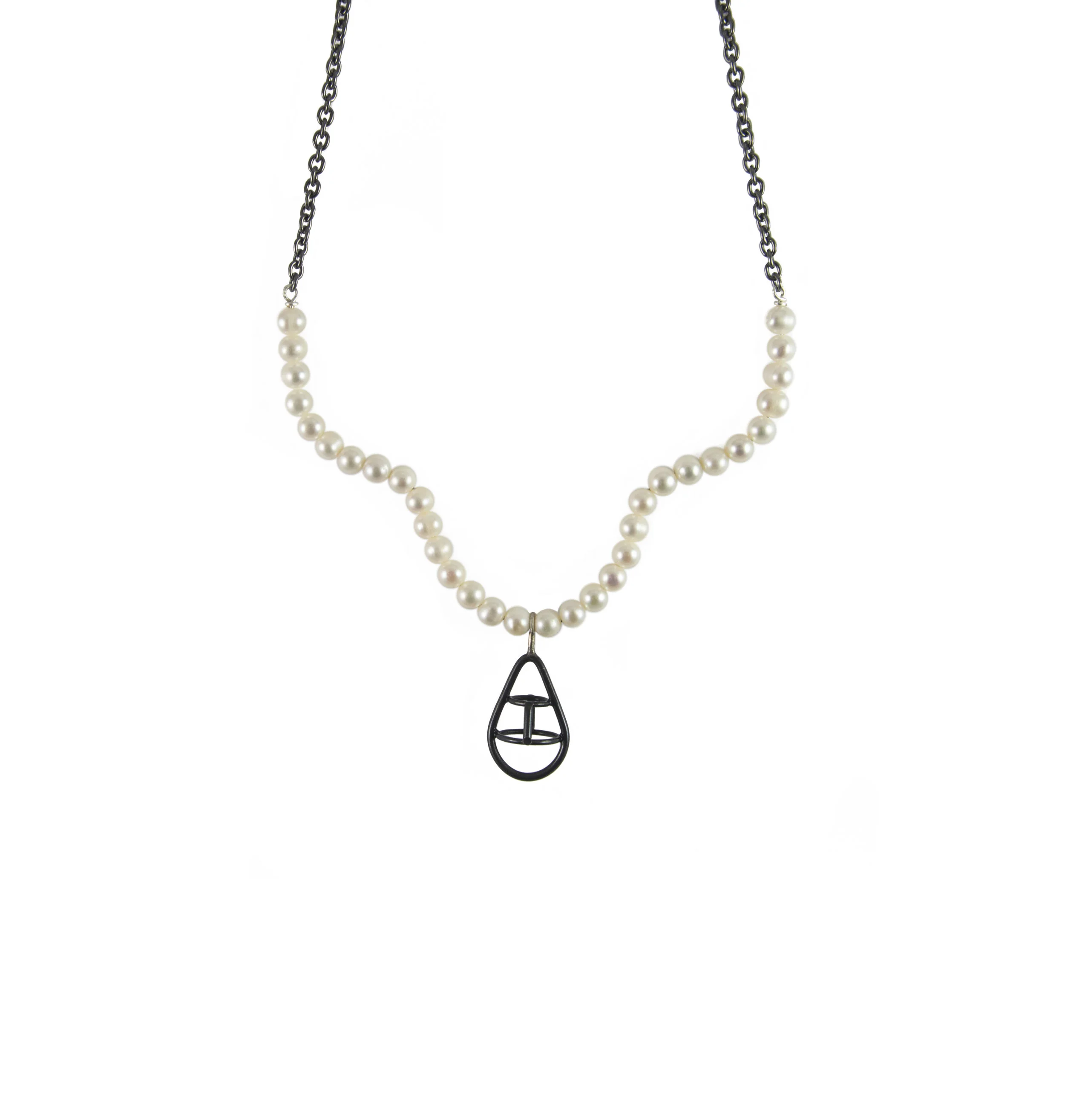 mild steel, cultured pearls, sterling silver, ruthenium plated sterling silver chain 16"